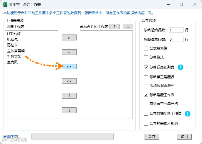 单击【易用宝】→【合并与拆分】→【合并工作表】。