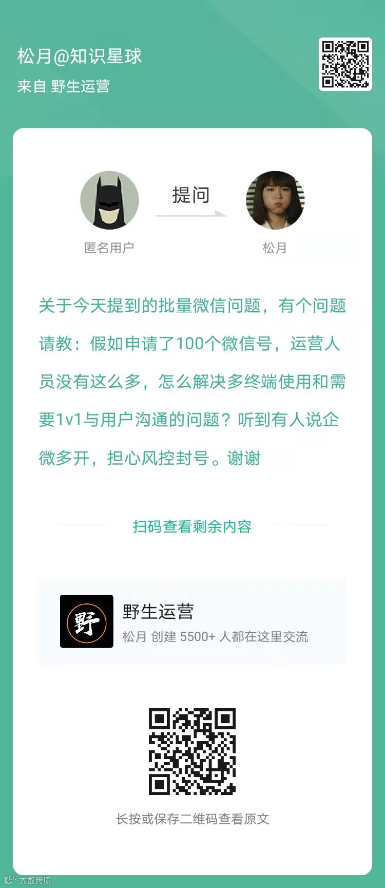 1、提问:申请了100个微信号,怎么解决多终端与用户沟通的问题?听到有人说企微多开,有点担心风控封号?(扫码看全文)
