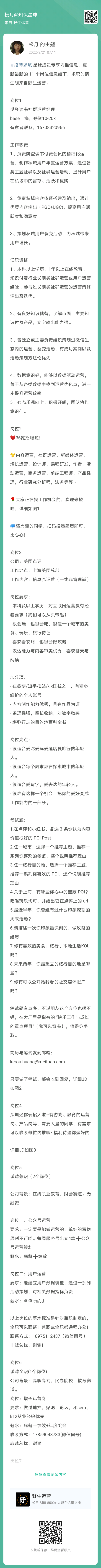 上周更新了 11 个岗位信息如下,求职时请注明来自野生运营,扫码申请岗位👇