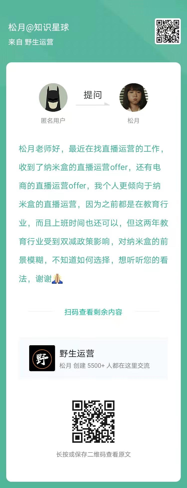 4、提问:收到了纳米盒的直播运营offer,还有电商的直播运营offer,不知道该怎么选择?(扫码看全文)