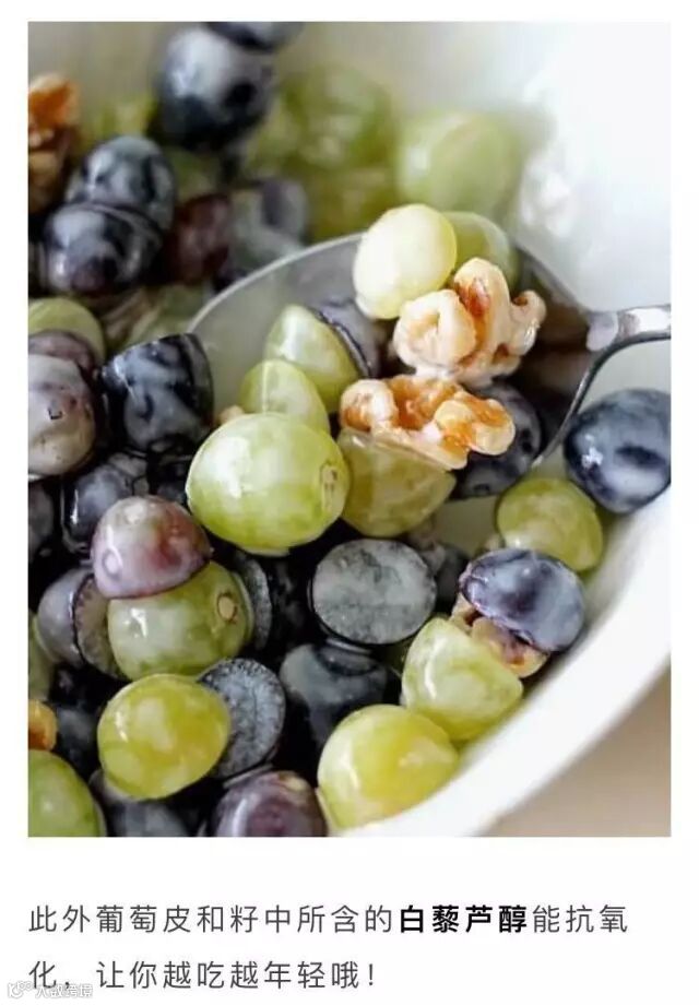 紫葡萄中富含花青素和类黄酮,都是强力抗氧化剂,能有效对抗和清除自由基,防止衰老。其中所含的多酚还能保护肌肤,令肌肤再生,光滑有弹性。