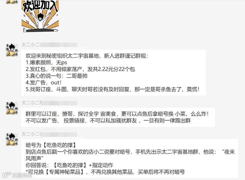 社群是太二酸菜鱼整个微信生态的私域运营重点,作为可以重复多次触达用户且几乎零成本的渠道,将社群放在首要位置简直不能再水到渠成。而在社群中引导用户消费or复购的主要抓手就是“暗号”。