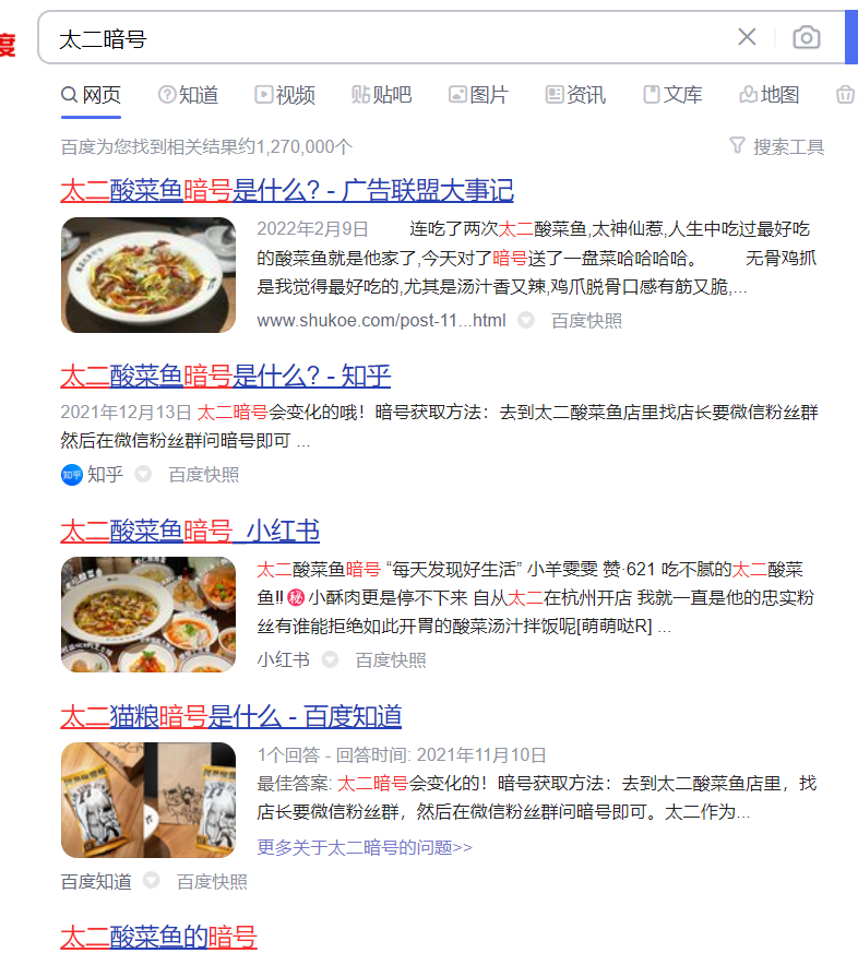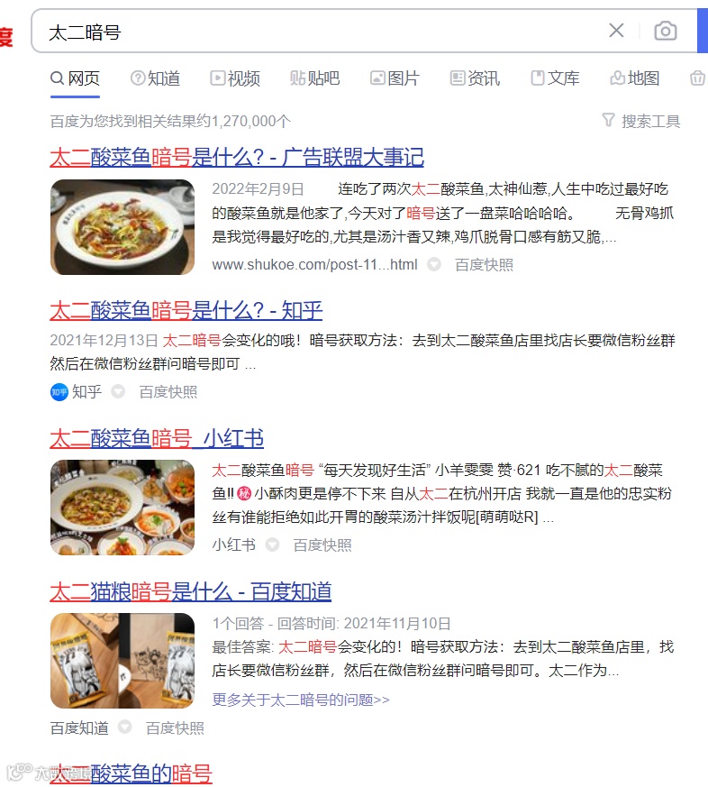 Attention:趣味性玩法,并且在个大平台上都有相关的关注度,太二酸菜鱼贴吧中热门帖子几乎都是“社群暗号”相关的内容,极大的引起了用户的猎奇心理与积极性,除了太二这个玩法出圈以外暂时没有看到其他品牌的相关活动