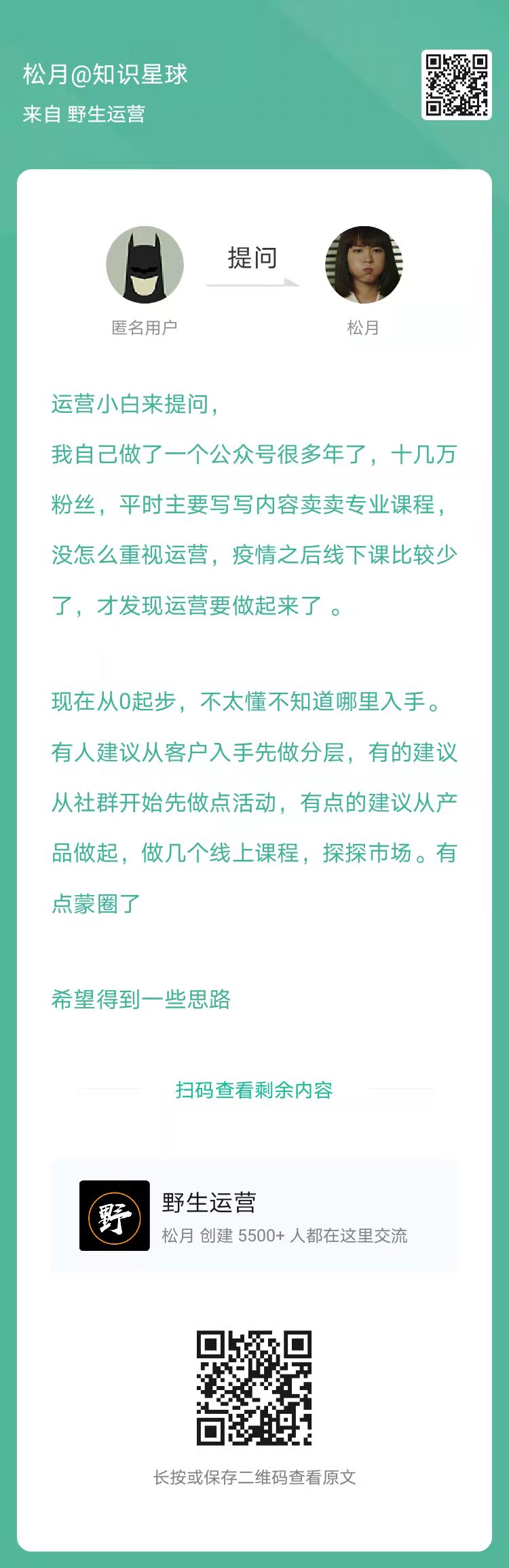 2、提问:现在从0起步运营公众号,之前有一部分粉丝和内容沉淀,请问要怎么开始?(扫码看全文)