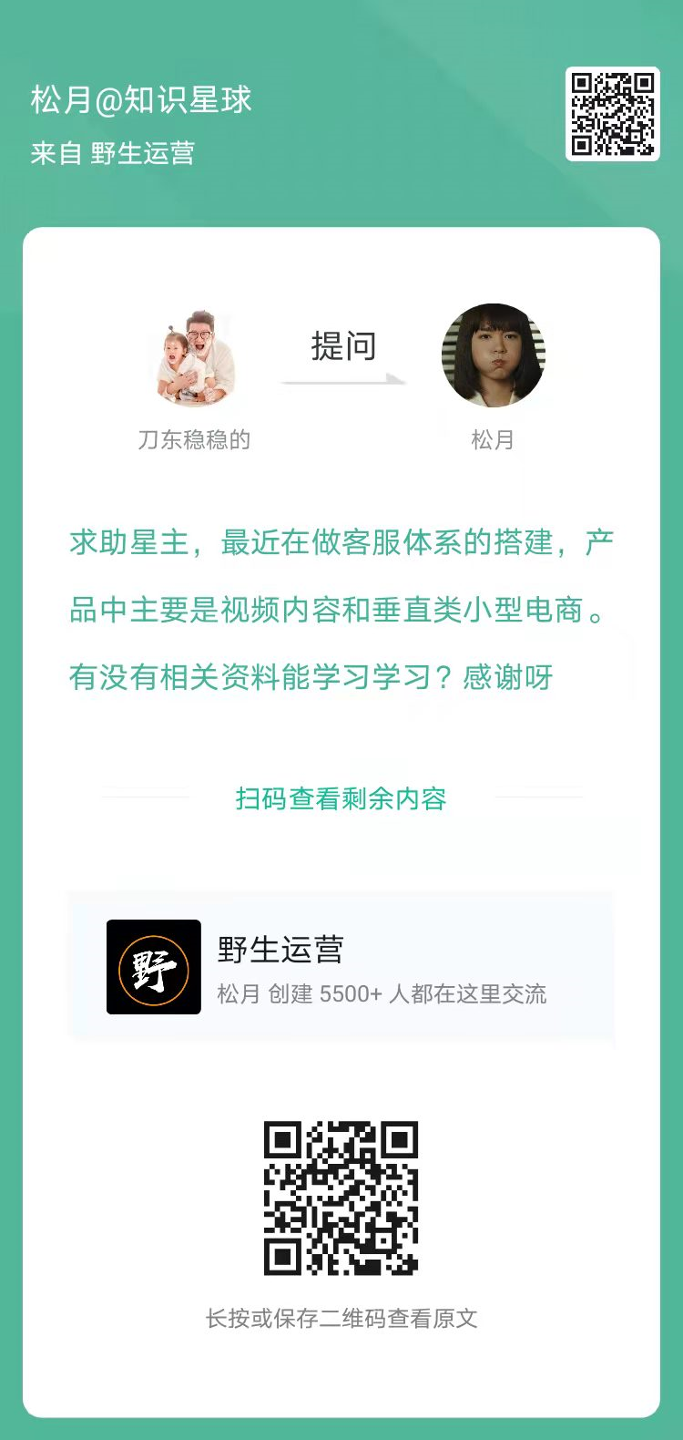 3、提问:最近在做客服体系的搭建,产品中主要是视频内容和垂直类小型电商。有没有相关资料能学习学习?(扫码看全文)