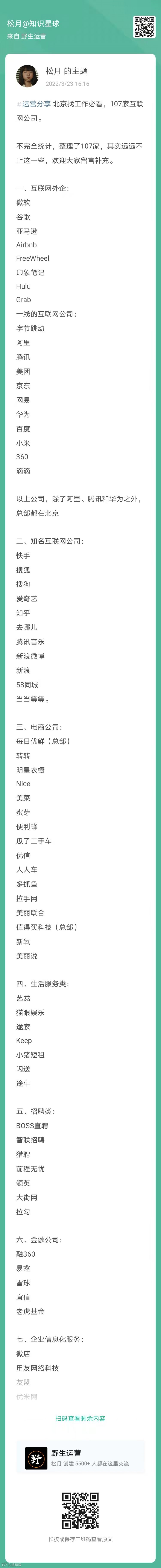 9、松月:北京找工作必看,107家互联网公司(扫码看全文)