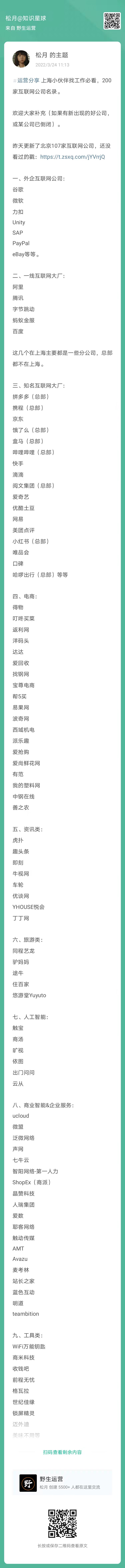 11、松月:上海小伙伴找工作必看,200家互联网公司名录(扫码看全文)