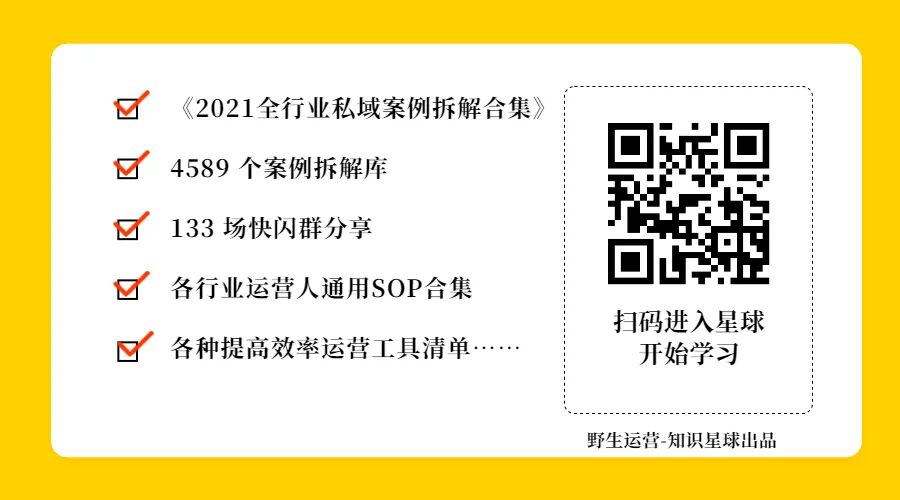 欢迎加入野生运营星球,每周一次快闪分享、运营人学习一手资料、1V1答疑……等硬核干货,而且还能一次入手包括 《2022全行业私域增长案例拆解合集》、4589 个案例拆解全库、130+ 场群分享的音频+逐字稿、N多运营工具包和资料,就问你一句,值不值?