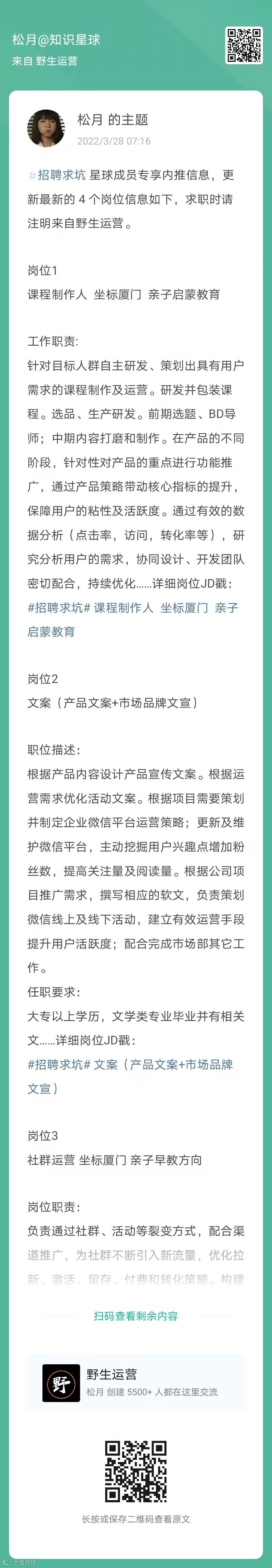 上周更新了 4 个岗位信息如下,求职时请注明来自野生运营,扫码申请岗位👇