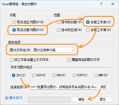 在弹出的导出为图片对话框中,选择导出对象为图片,选择当前工作表,保存选项,选择图片文件名图片左侧单元格。