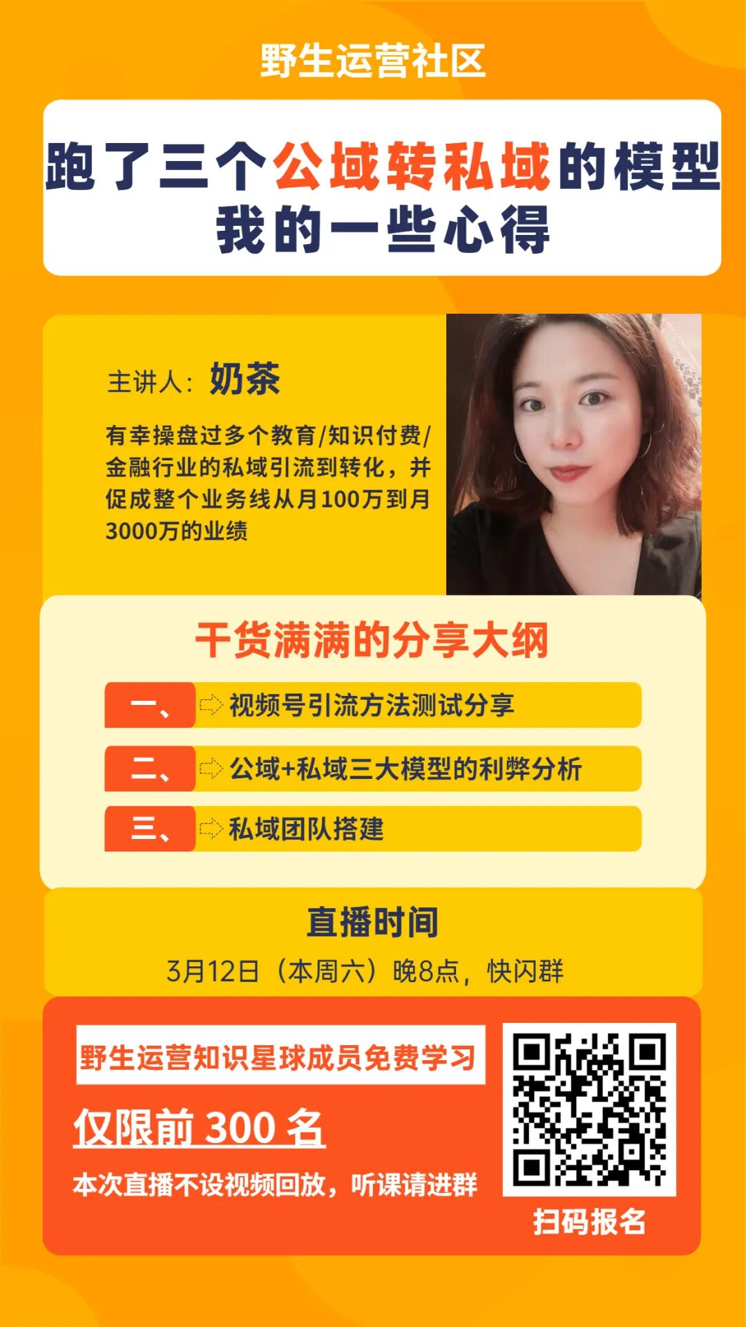 本周六晚8点,我邀请到奶茶,有幸操盘过多个教育/知识付费/金融行业的私域引流到转化,并促成整个业务线从月100万到月3000万的业绩,带来分享《跑了三个公域转私域的模型,我的一些心得》。本次分享不设视频回放,报名截止本周六(3月12日)晚7点。