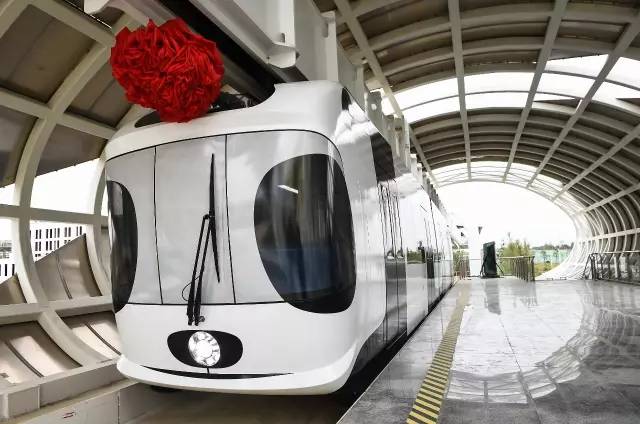 这条新能源空铁以熊猫为装饰元素,为架设于5米之上空中的白色轨道,呈U字形,全长1.4公里。