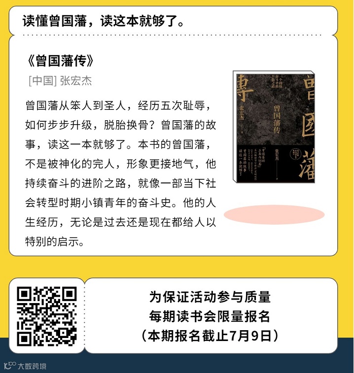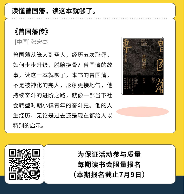 插入一条:野生运营读书会每月会雷打不动共读一本书,下一本读书书目已经出炉!是的,《曾国藩》传!曾国藩从平庸之辈成为千古完人,天资一般,家境一般,直到人生中年后,才崭露头角,开始开挂,可以说是普通人可以学习的偶像,欢迎来报名读书呀: