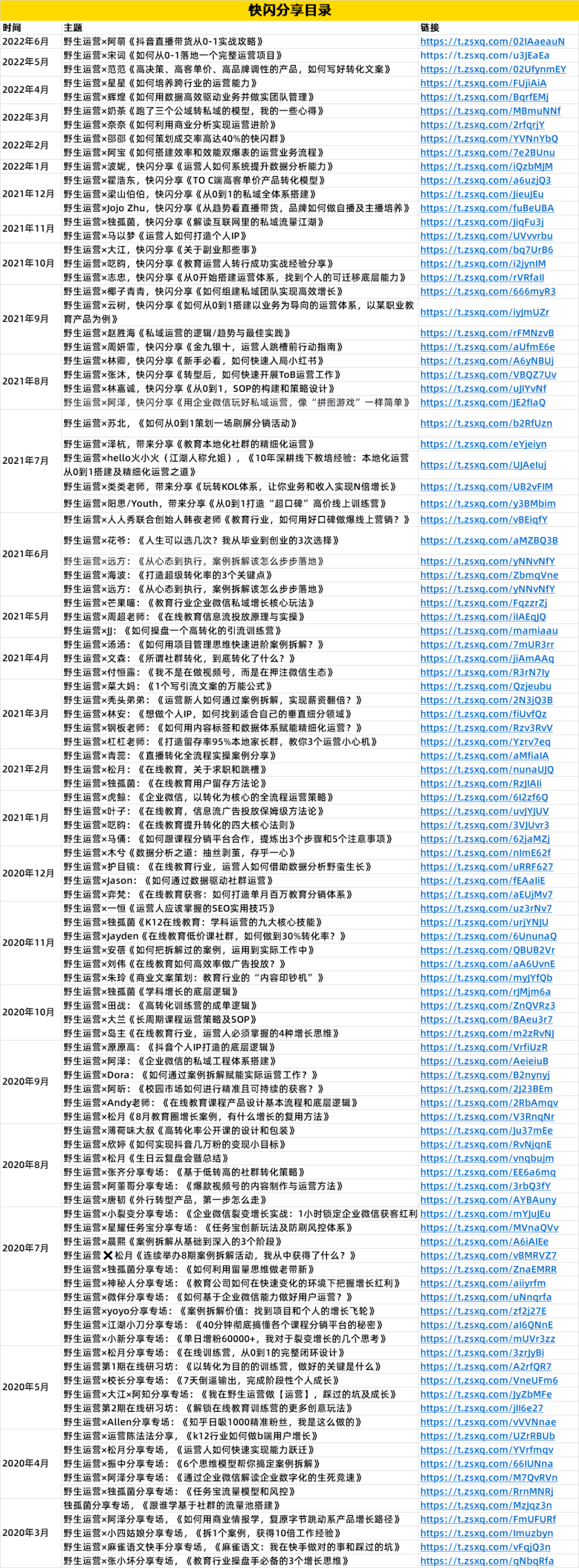 熟悉野生运营的小伙伴都知道,这里每月会举行 2 次快闪分享,聚焦运营人在实际工作中的痛点,目前已经举办了包括《抖音直播带货从0-1实战攻略》、《高决策、高客单价、高品牌调性的产品,如何写好转化文案》、《如何策划成交率高达40%的快闪群》等 130+ 场次,每次分享后很多小伙伴会私信松月,告诉我TA的感受:太有收获了、解决了我目前业务遇到的具体问题、这个工具/模板分享的太好了、非常受用……