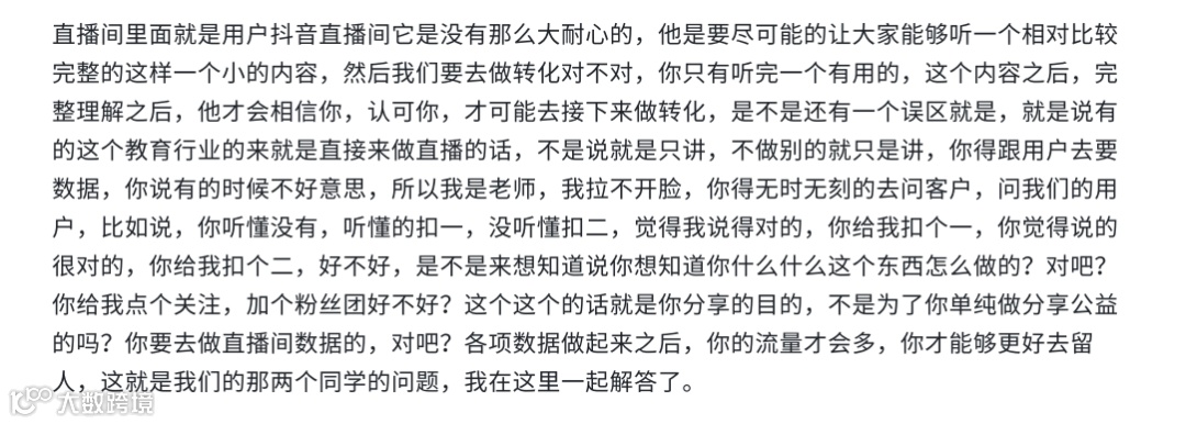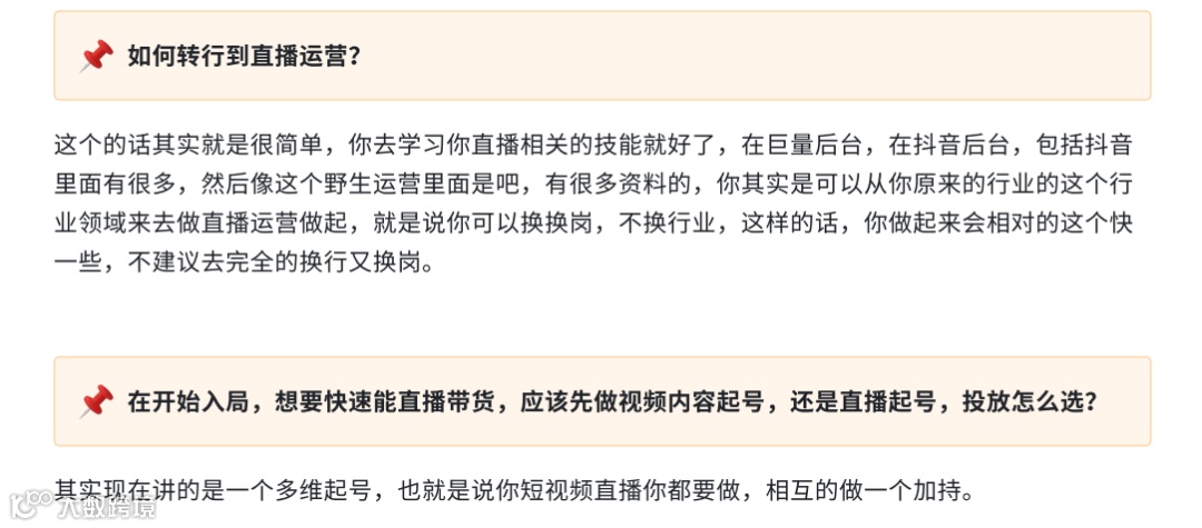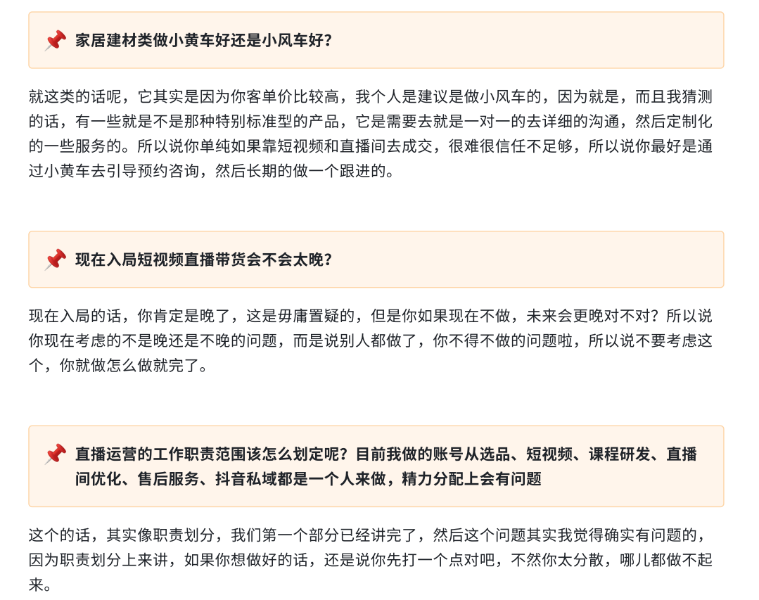 本文来自6月4日晚8点,群友阿萌在野生运营快闪群里的部分分享内容。在正式分享前,我们在群里发起了一波问题接龙,阿萌对抖音直播带货从 0 到 1,最高频出现的 9个问题进行了集中答疑,包括单品复盘如何做、知识类博主带课怎么提高转化、现在入局短视频直播带货会不会太晚……