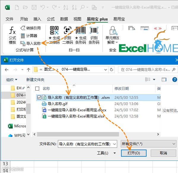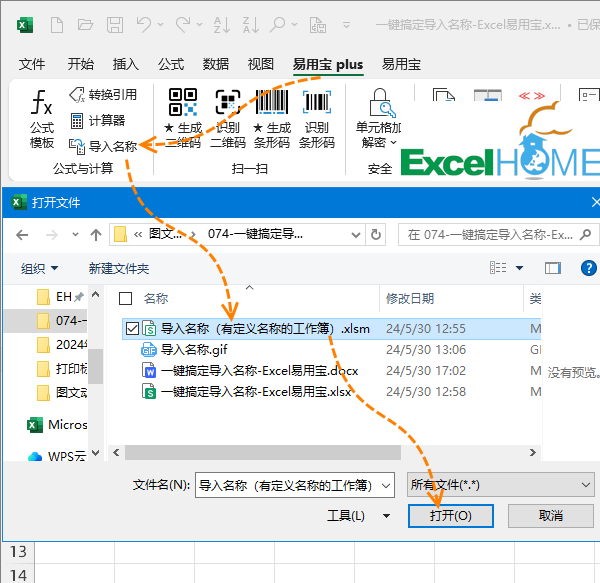 点击Excel易用宝plus,导入名称,浏览到已有名称的工作簿,点击打开。