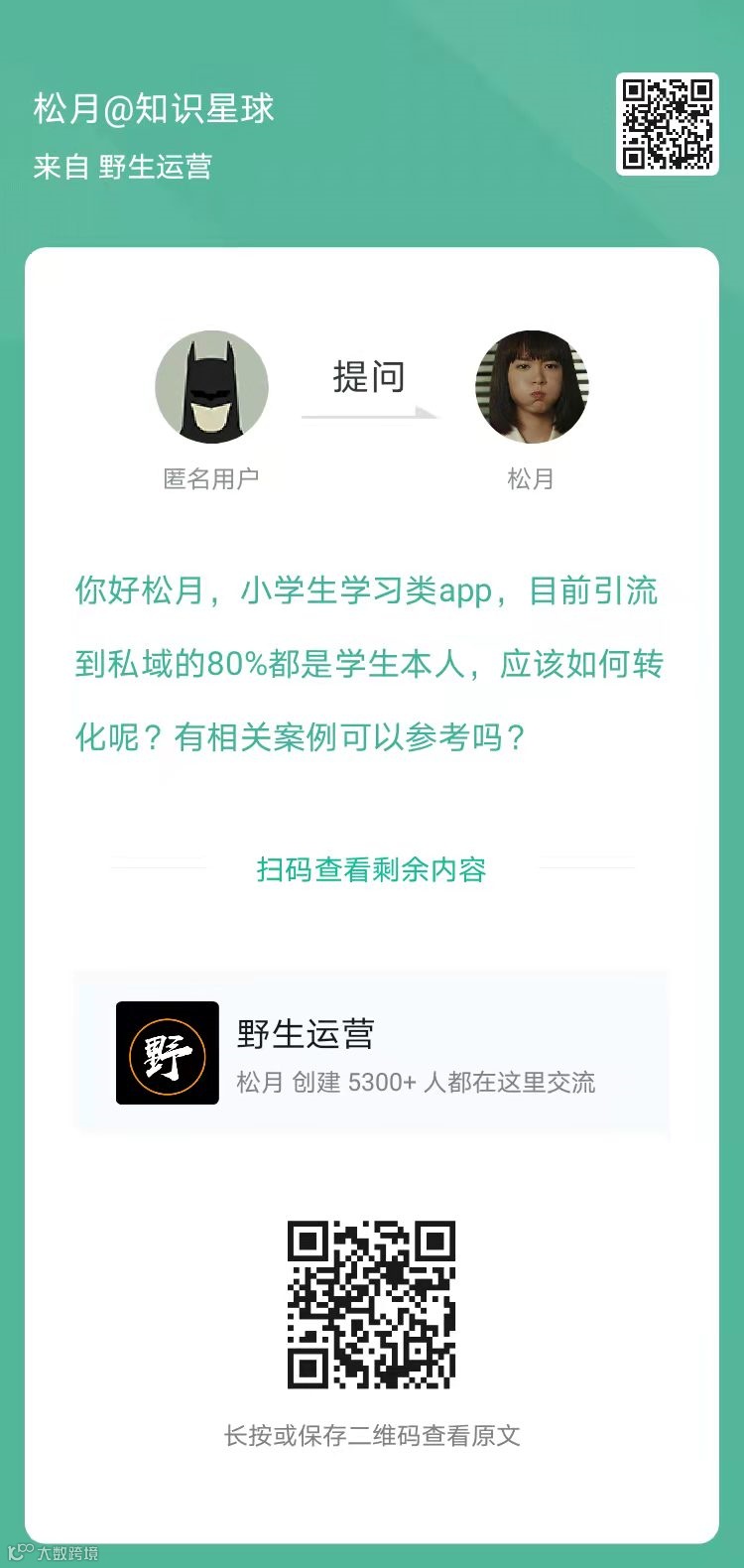 1、提问:小学生学习类app,目前引流到私域的80%都是学生本人,应该如何转化呢?有相关案例可以参考吗?(扫码看全文)