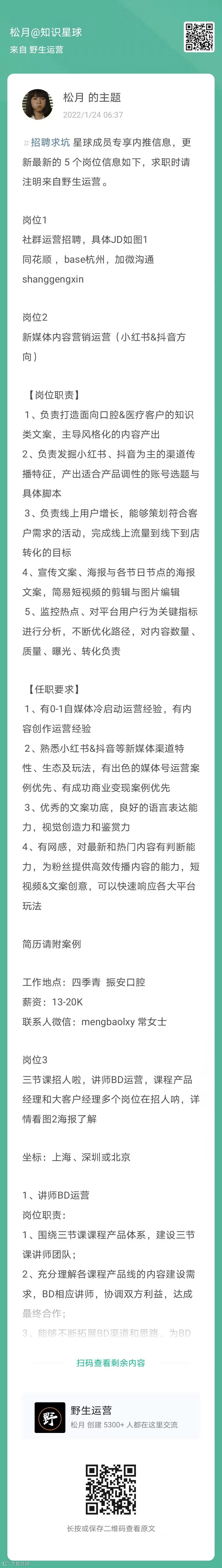 上周更新了 5 个岗位信息如下,求职时请注明来自野生运营,扫码申请岗位👇