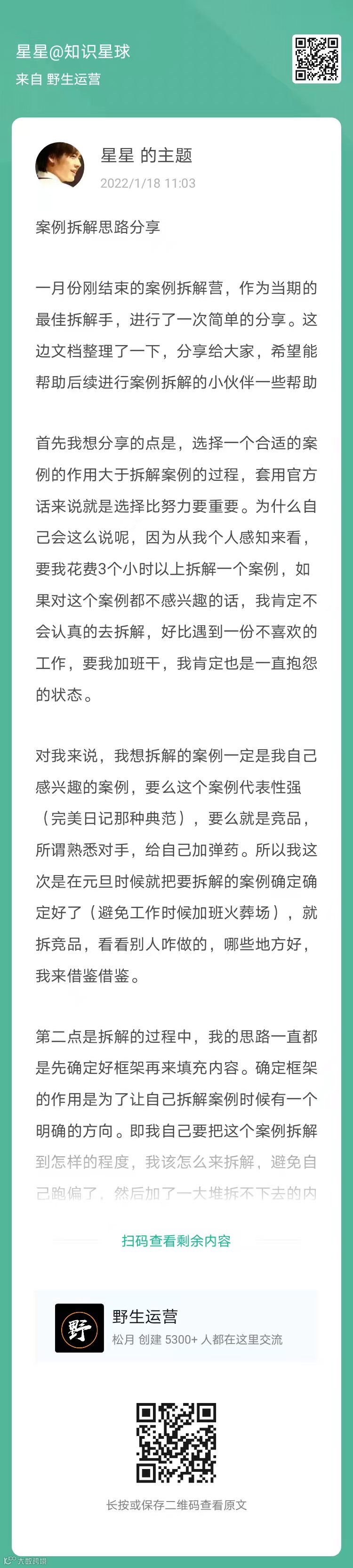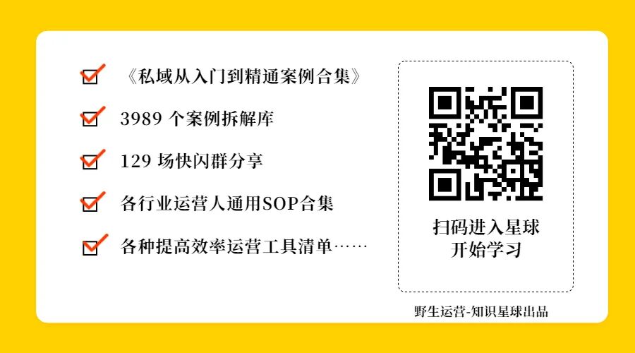 欢迎加入野生运营星球,每周一次快闪分享、运营人学习一手资料、1V1答疑……等硬核干货,而且还能一次入手包括 《2021上半年增长案例合集》、3989 个案例拆解全库、120+ 场群分享的音频+逐字稿、N多运营工具包和资料,就问你一句,值不值?