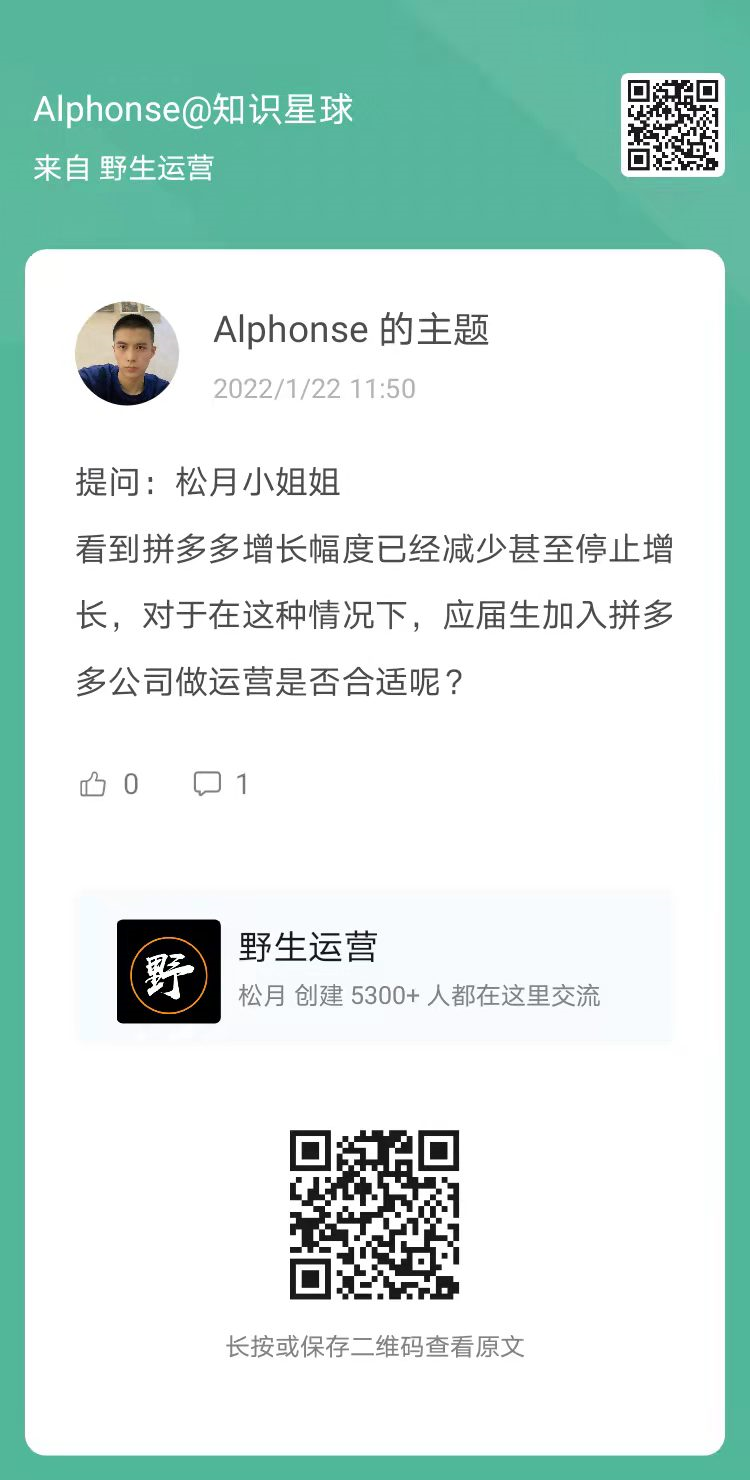 5、提问:我看到拼多多增长幅度已经减少甚至停止增长,这种情况下,应届生加入拼多多公司做运营是否合适呢?(扫码看全文)