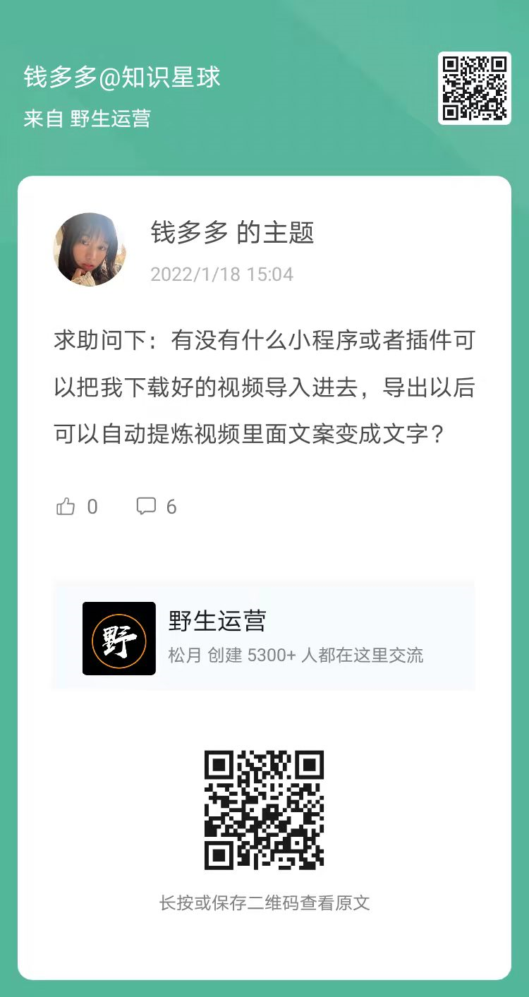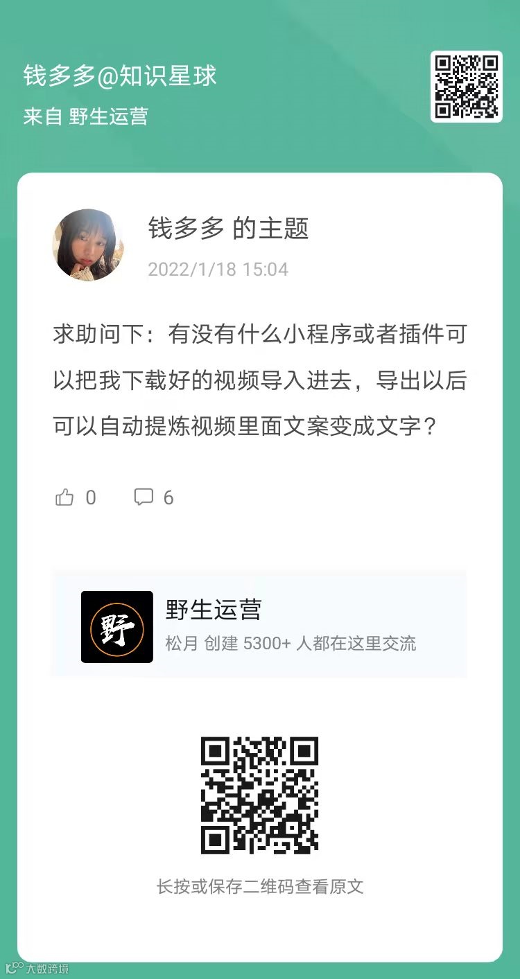 4、提问:有没有什么小程序或者插件可以把我下载好的视频导入进去,导出以后可以自动提炼视频里面文案变成文字?(扫码看全文)