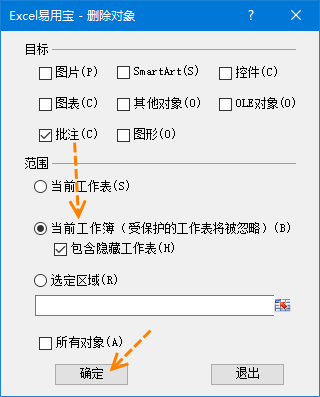 打开删除对象面板,目标中只选择批注,范围选择当前工作簿,注意哈,如果工作簿中有保护工作表,保护的工作表将被忽略此操作。