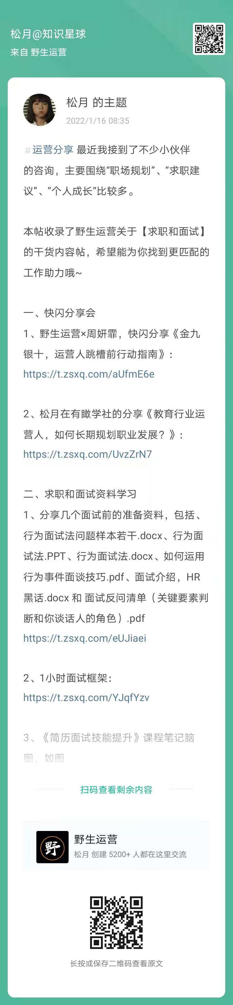 25、松月:本帖收录了野生运营关于【求职和面试】的干货内容帖,希望能为你找到更匹配的工作助力(扫码看全文)