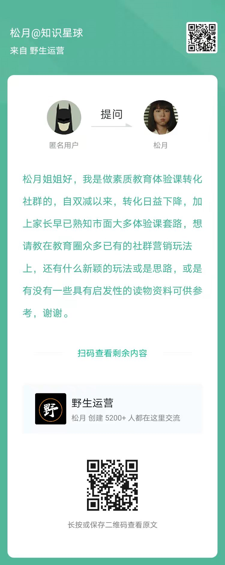3、提问:我是做素质教育体验课转化社群的,自双减以来,转化日益下降,加上家长早已熟知市面大多体验课套路,想请教还有什么新颖的玩法或是思路?(扫码看全文)