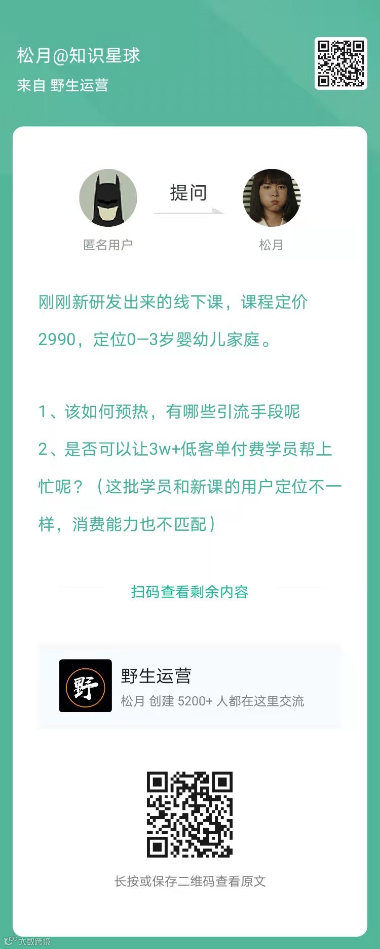 5、提问:刚刚新研发出来的线下课,课程定价2990,定位0-3岁婴幼儿家庭,想问问有什么引流手段?(扫码看全文)