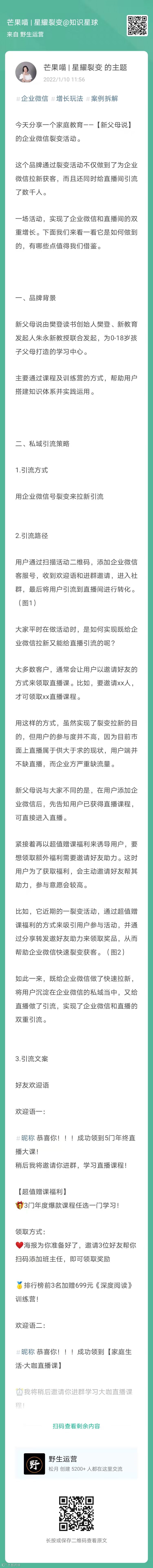 2、芒果喵:【新父母说】的企业微信裂变活动案例拆解(扫码看全文)