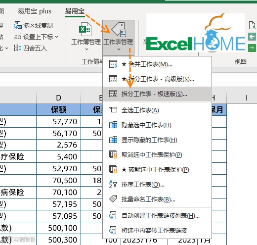 点击Excel易用宝,工作表管理,拆分工作表-极速版。