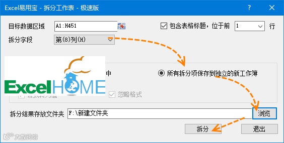 在弹出的拆分工作表对话框中,选择拆分字段,选择所有拆分项保存到独立的新工作簿,点击拆分。