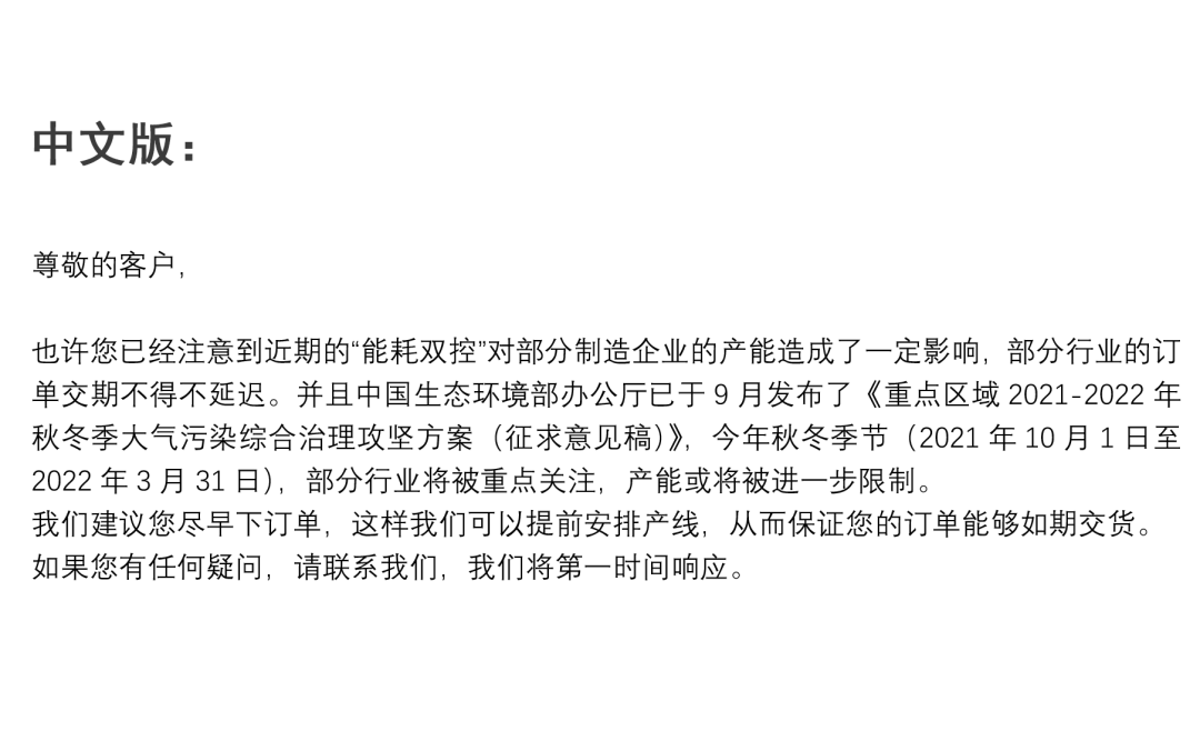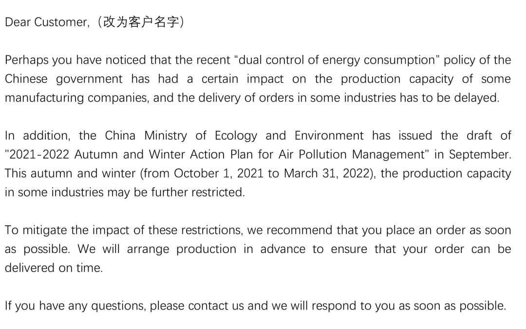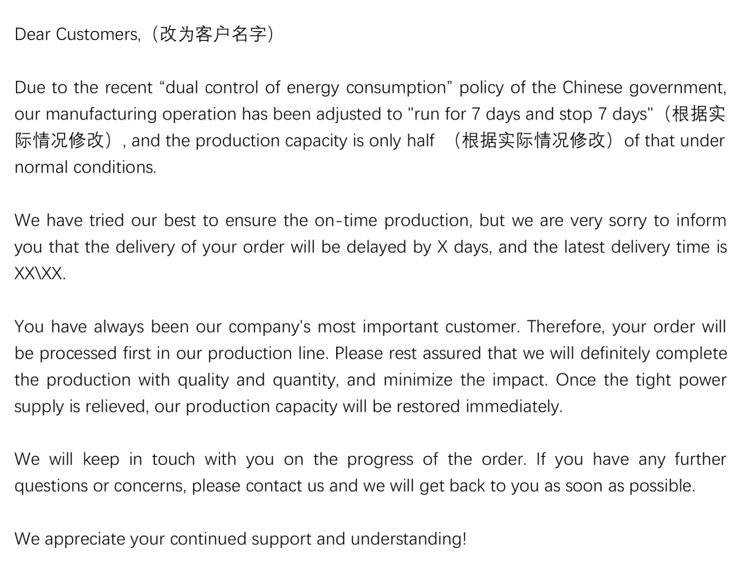 限电减产造成订单延误、甚至逼单