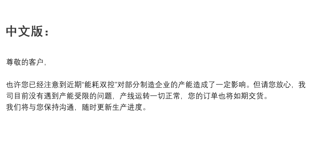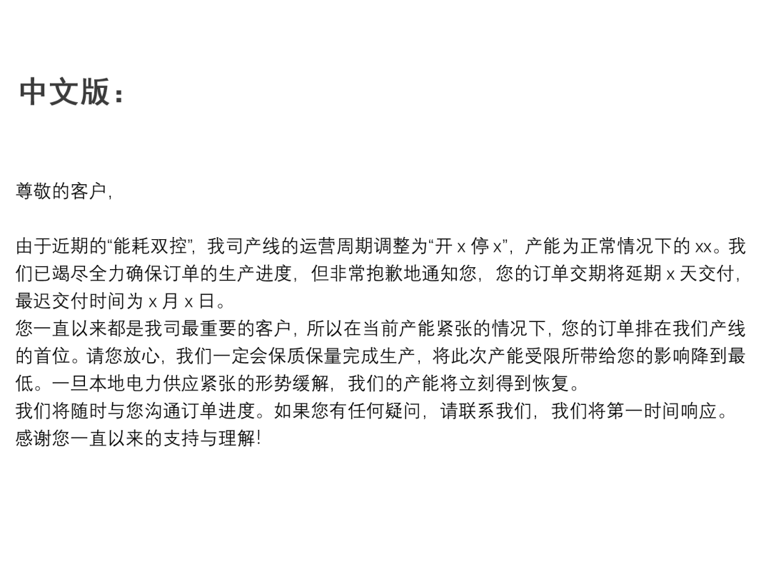 注:以上因文章篇幅原因,以图片形式展示,想要文档版本的老板,请加小编微信,回复“限电英文”获取~