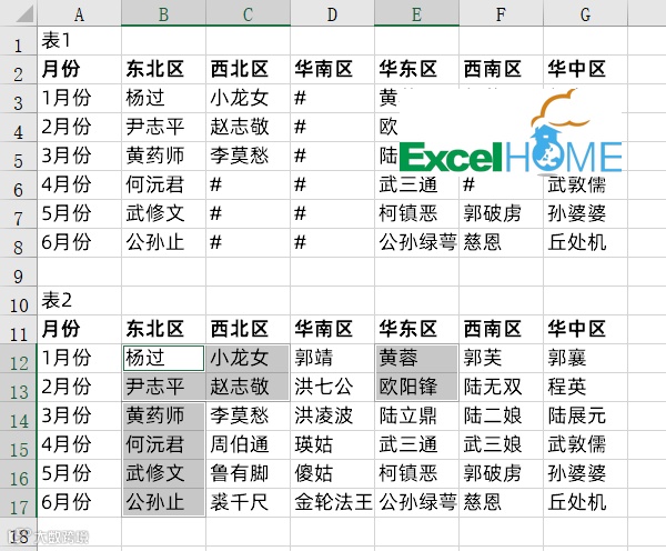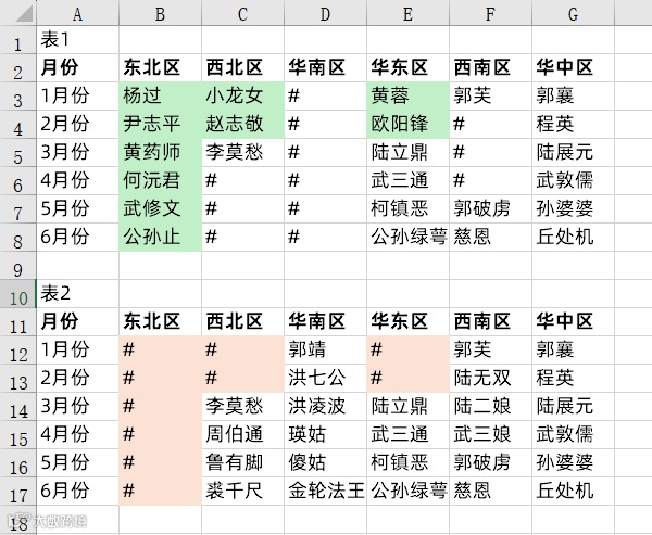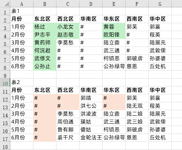 部门数据协同,现在需要将两个部门做的数据表汇集到一起,把表1绿色单元格区域的内容复制到表2红色单元格区域中。