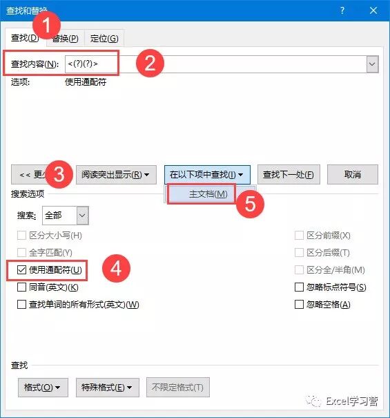 Ctrl+H打开查找替换对话框,点击查找,输入<(?)(?)>,点开更多,勾选使用通配符,在主文档中查找。