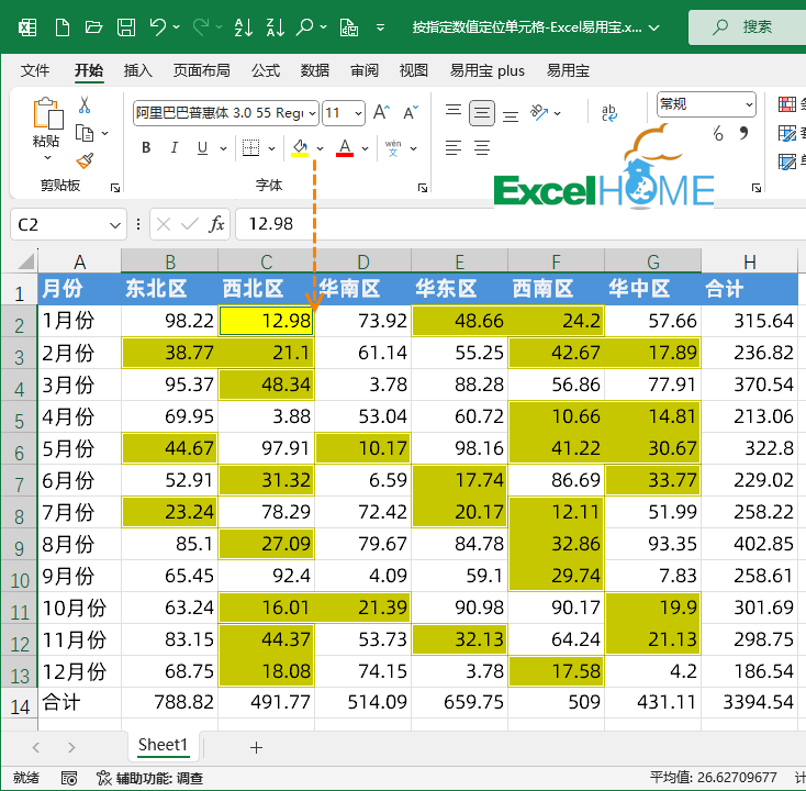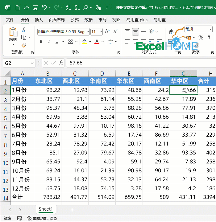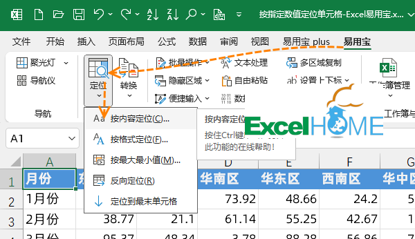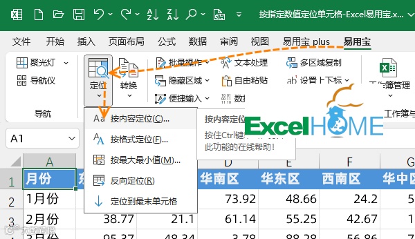 鼠标指针点击数据区域任意单元格,点击Excel易用宝,定位,按内容定位。