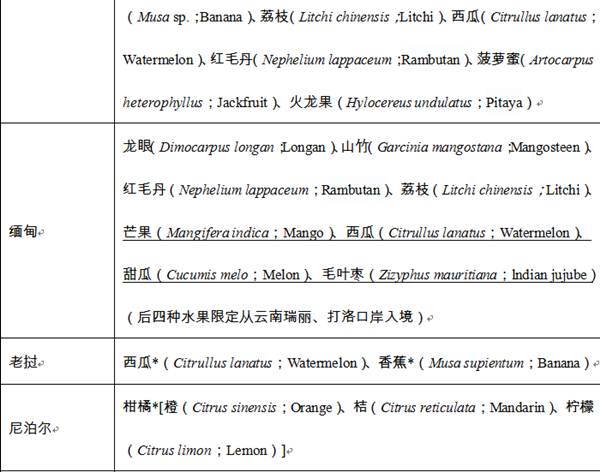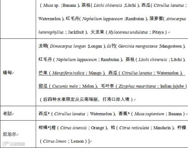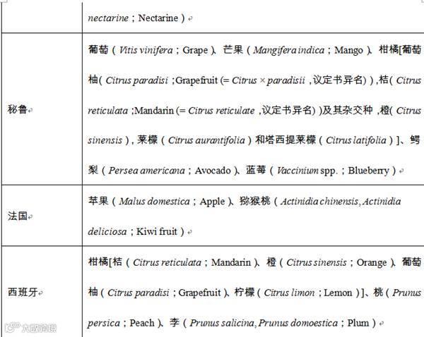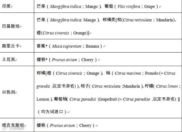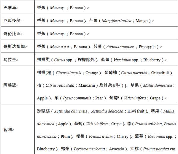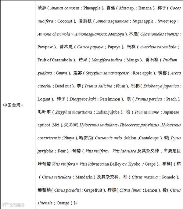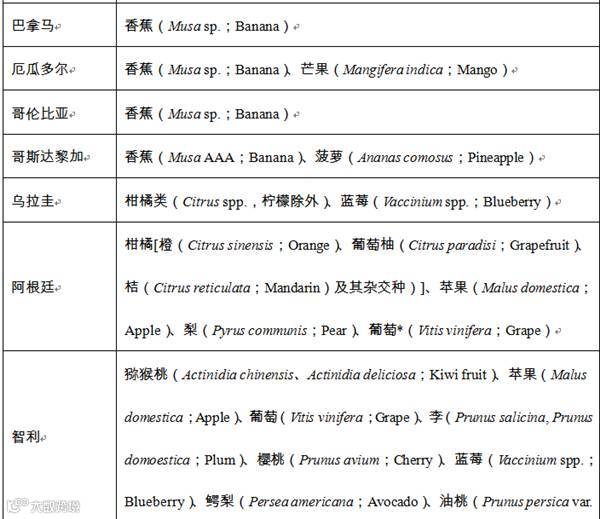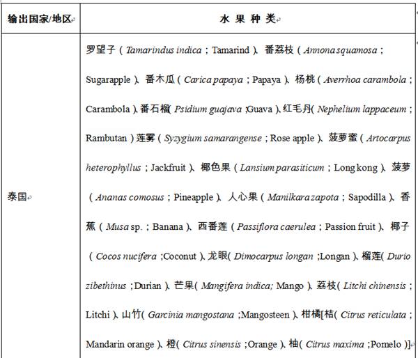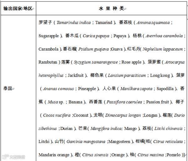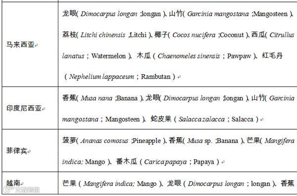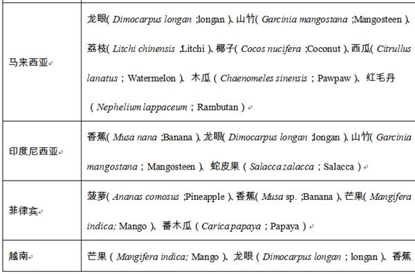 5月24日,质检总局发布了《获得我国检验检疫准入的新鲜水果种类及输出国家地区名录》(2017年5月11日更新),涉及泰国、马来西亚、印度尼西亚等43个国家和地区。详细情况见下表。