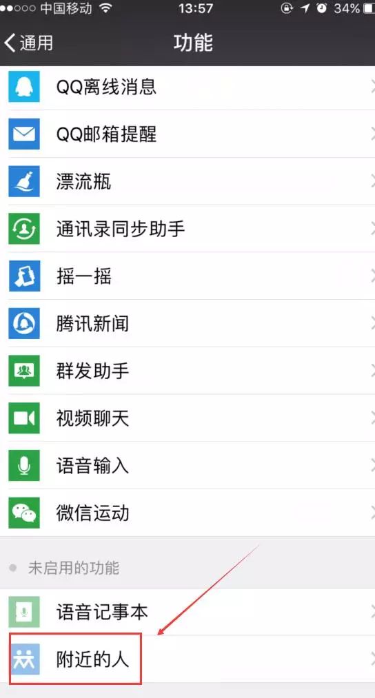 打开微信,依次点击【我】—【设置】—【通用】—【功能】,选择【附近的人】,点击进去后点击关闭【清除我的位置信息】和【停用】。