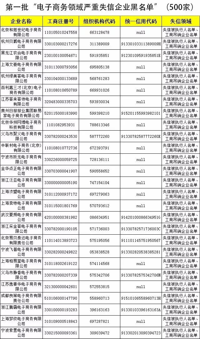 国家信息中心副主任周民表示,在全国信用信息共享平台上有关部门共享的黑名单信息中,经分析比对,共梳理出电子商务黑名单企业6440家,其中首批500家已在“信用中国”网站公布。