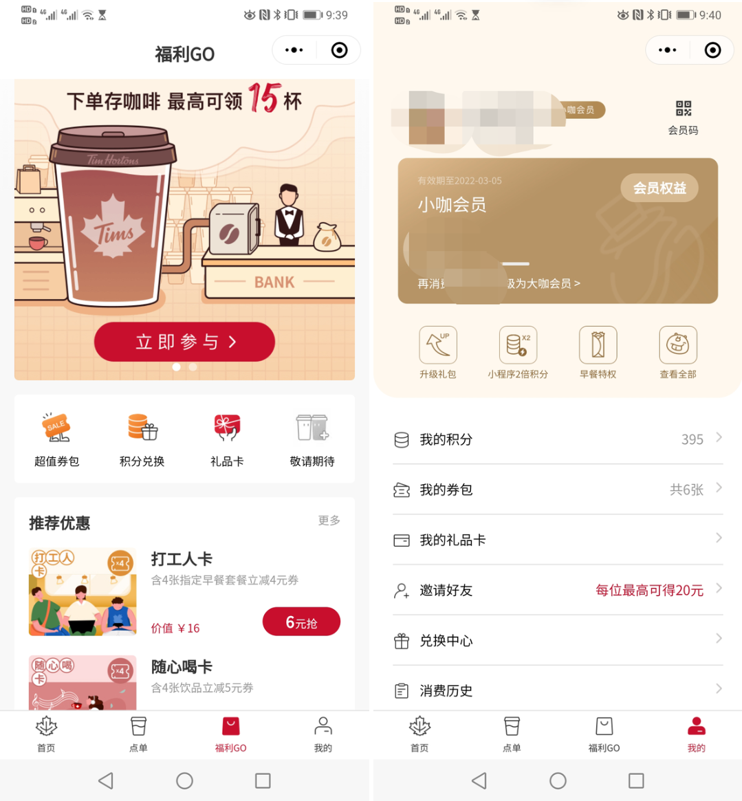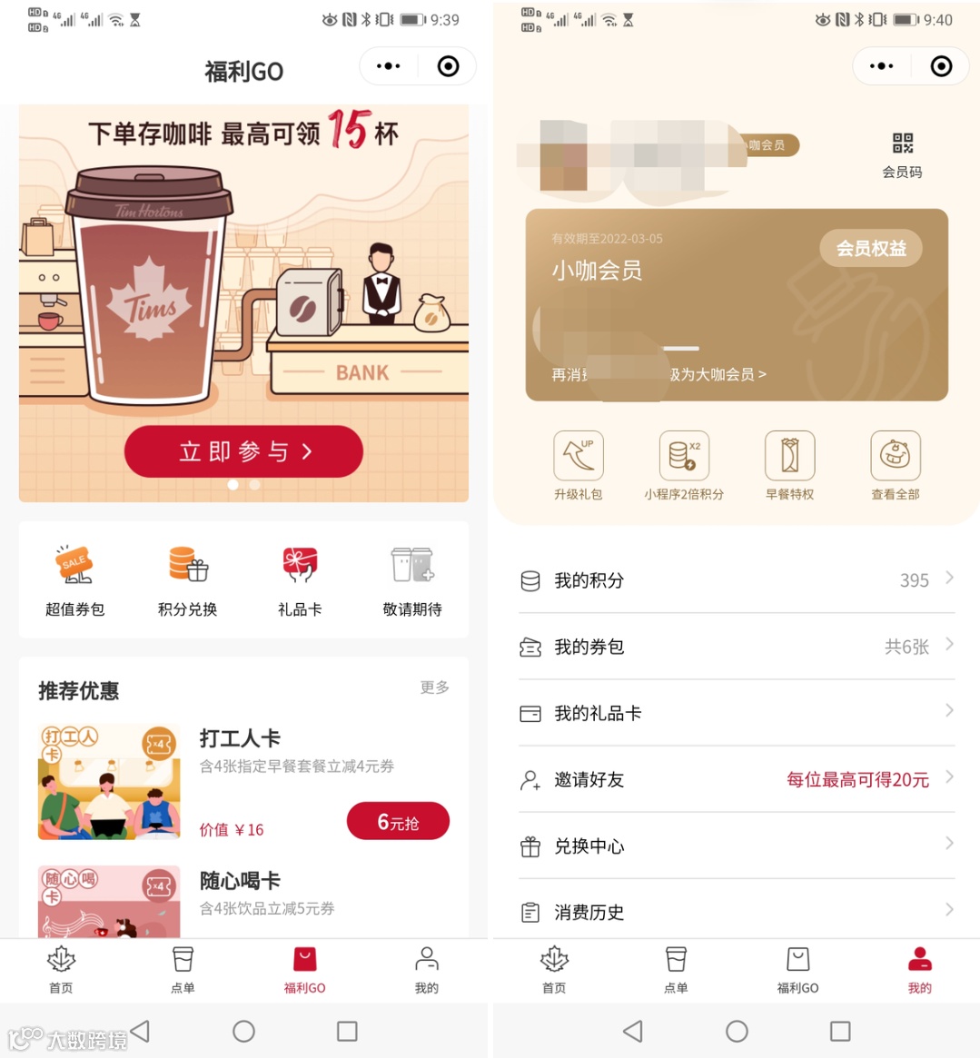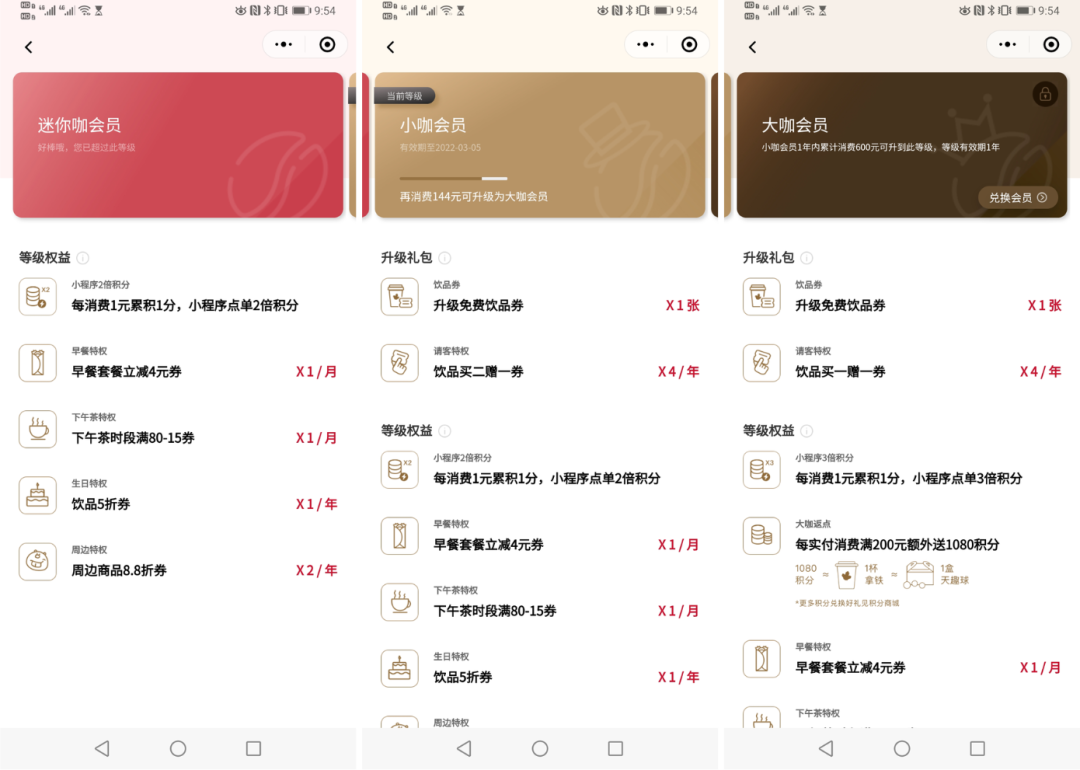 会员权益,迷你咖、小咖会员小程序点单2倍积分,大咖会员3倍积分(星巴克是消费50才有积分)