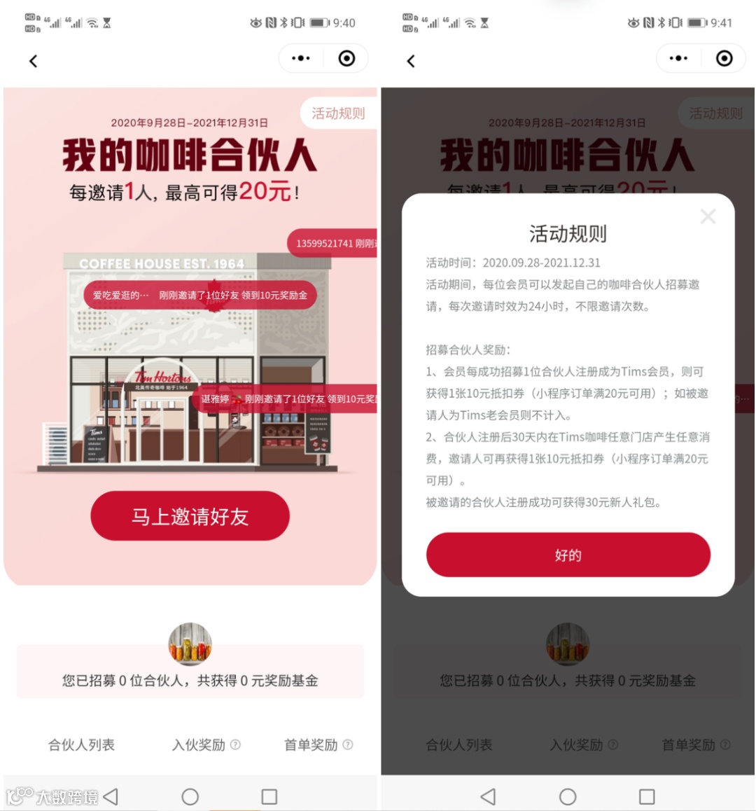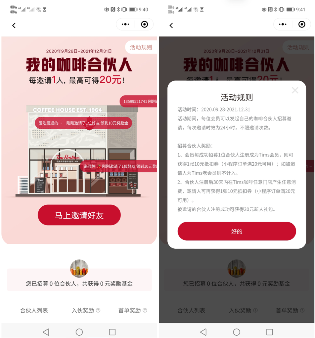 只要在24小时内招募咖啡合伙人注册会员,就能得到1张10元的优惠券,而且不限邀请次数。
