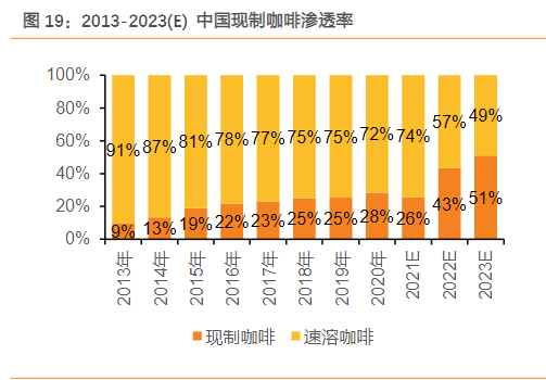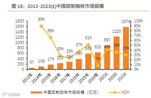 2018年,中国台湾、美国和日本的现制咖啡消费占比分别为83.3%、80.7%和63.1%,而同期中国仅为25.0%。星巴克1999年进入中国,2014年星巴克甄选品牌进入中国,通过好产品对消费者进行教育,以一己之力推动中国现制咖啡市场扩容。根据弗若斯特沙利文数据,预计中国人均现制咖啡年消费量将从2020年的人均1.8杯增至2023年的人均5.5杯,现制咖啡市场规模将从2020年的633亿元增至2023年的1579亿元。