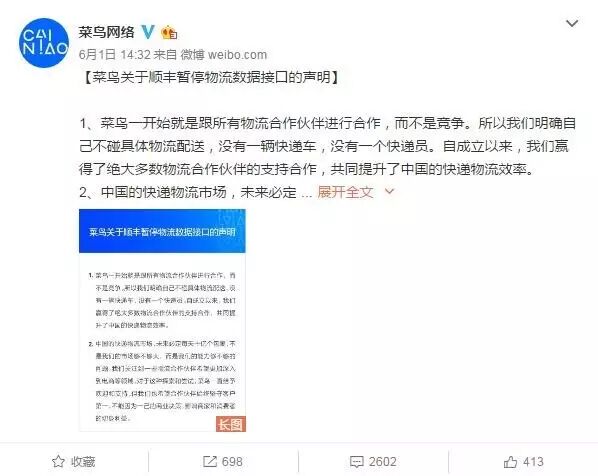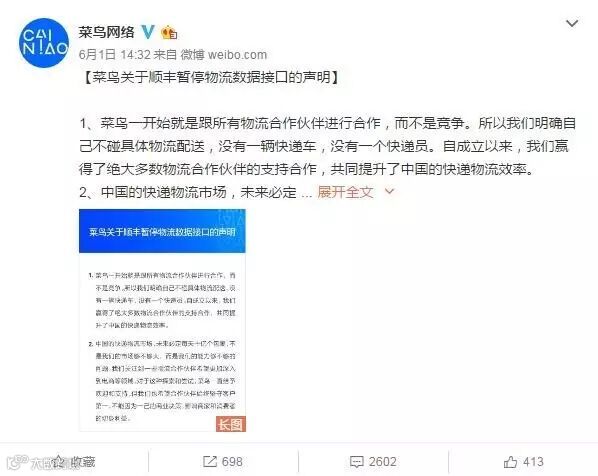 作为淘宝网物流及供应链平台的菜鸟网络,6月1日14:32分在其官方微博发布《菜鸟关于顺丰暂停物流数据接口的声明》,拉开了这场“罗生门”的序幕。