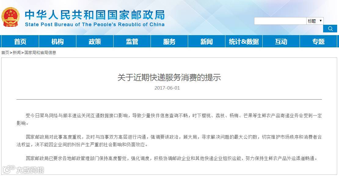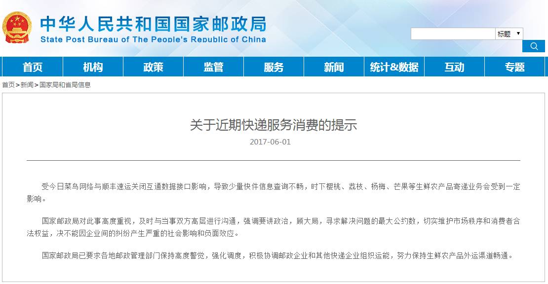 国家邮政局:请顺丰菜鸟顾全大局保生鲜运输
