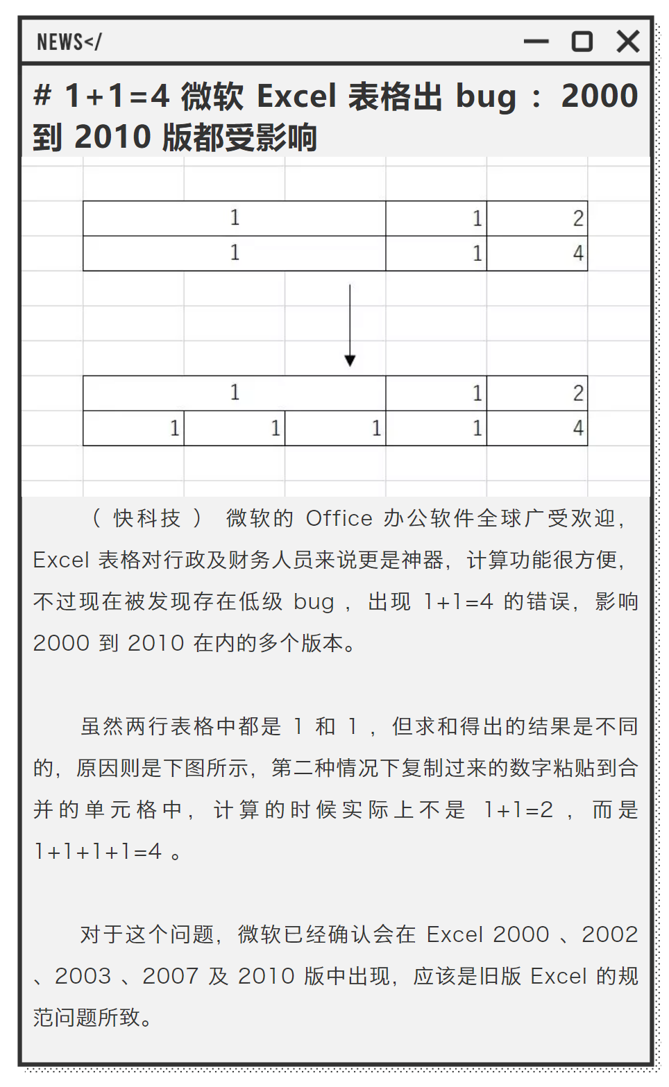 1+1=4 微软Excel表格出bug:2000到2010版都受影响