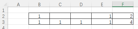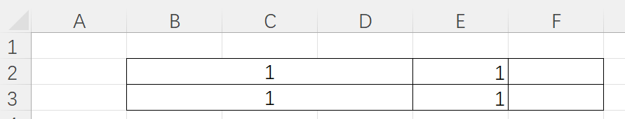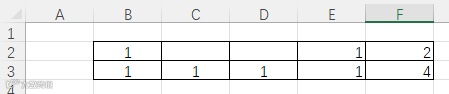 首先,有这么两行数据,B2:D2区域是合并单元格,B3:D3区域也是合并单元格,如图: