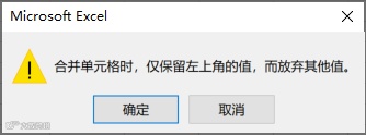 有合并单元格操作经验的小伙伴可能会问:如果被合并的多个单元格里面原本有数据,在执行合并的时候,Excel会只保留左上角单元格的数据,删除其他单元格的数据。就像这样的提示: