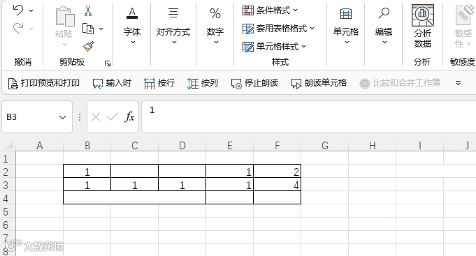 那么,为啥这2行的计算结果不同呢?我们分别把B2:D2和B3:D3取消单元格合并,就明白了,原来真正的数据是这样子滴: