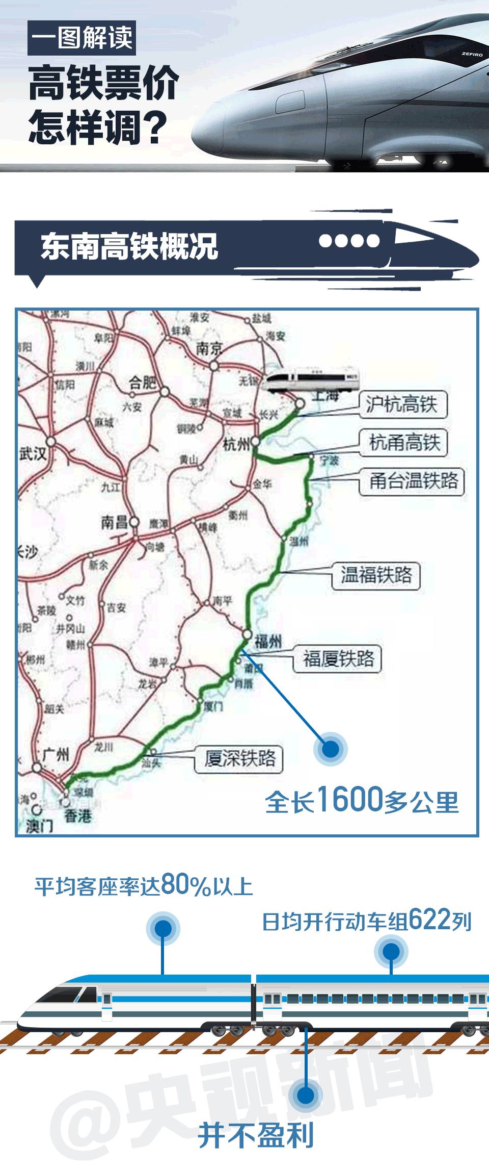 东南沿海高铁是由上海至杭州、杭州至宁波、宁波至深圳三段组成,其中沪杭段全长159公里,杭甬段全长155公里,甬深段全长1309公里。沪杭、杭甬段时速300公里高铁动车组票价不在调整范围。
